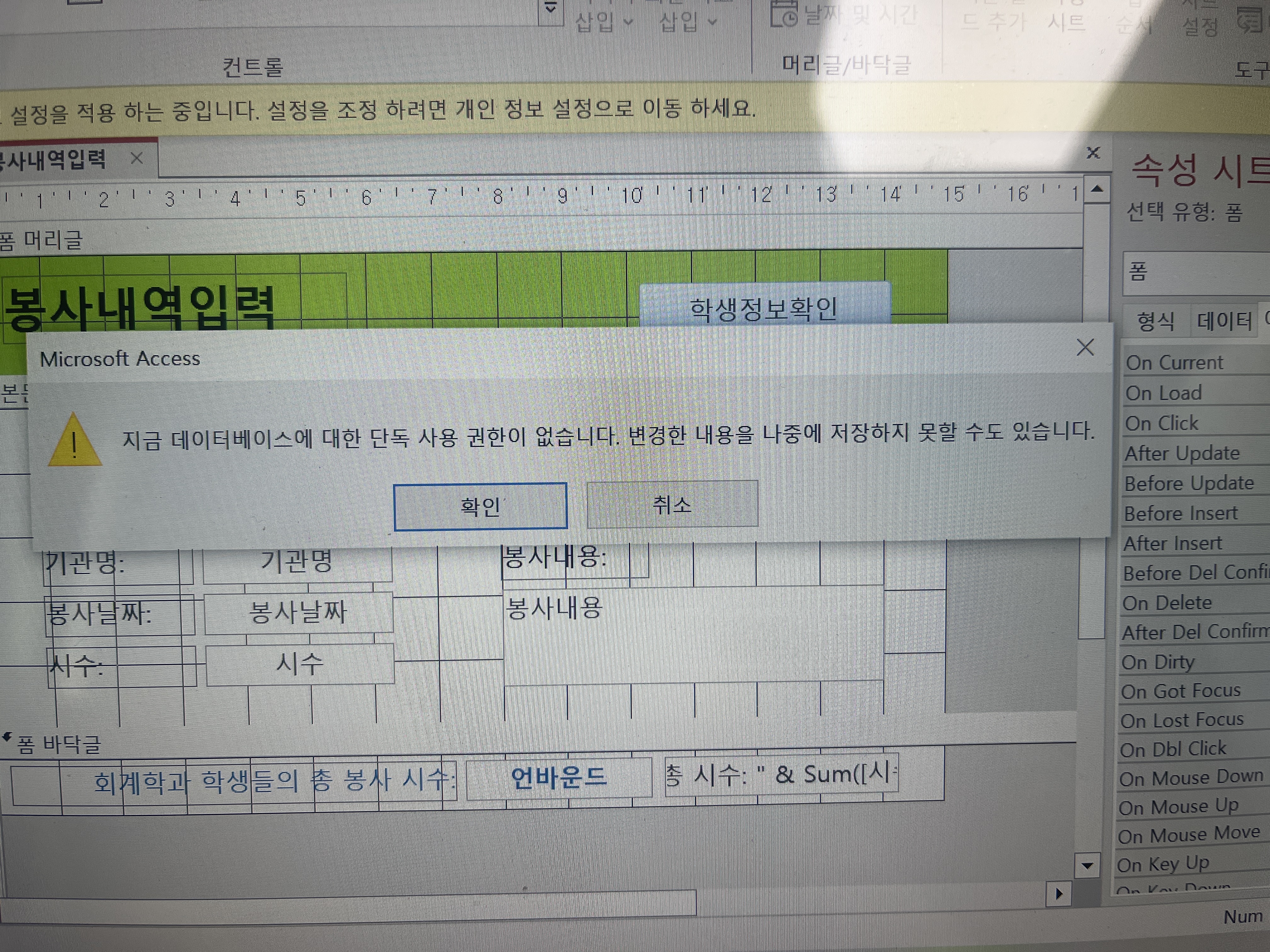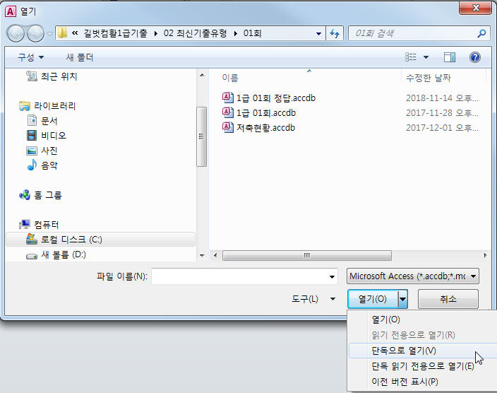 위와 같은 대화상자가 왜 나왔는지는 모르겠네요. 혹시 모르니 [파일]-[열기]를 선택한 다음 '열기' 대화상자에서 불러올 파일을 선택한 후 <열기> 단추 옆에 있는 삼각형을 클릭한여 [단독으로 열기]를 선택해서 파일을 열어 작업해 보세요.