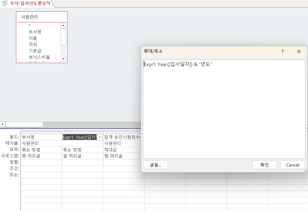 2. 쿼리 작성 4-4번 문제에서 년도 & 연산자를 이용하라 해서 사진과 같이 year([입사일자]) & "년도" 이렇게 했는데 답지는 format 함수를 사용했더군요. 어떤 함수를 이용하라 안했으니 제가 한 방법도 맞는지 궁금합니다.