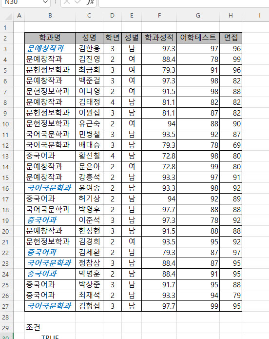 조건부 서식에서 전체테이블에 블록을 잡고