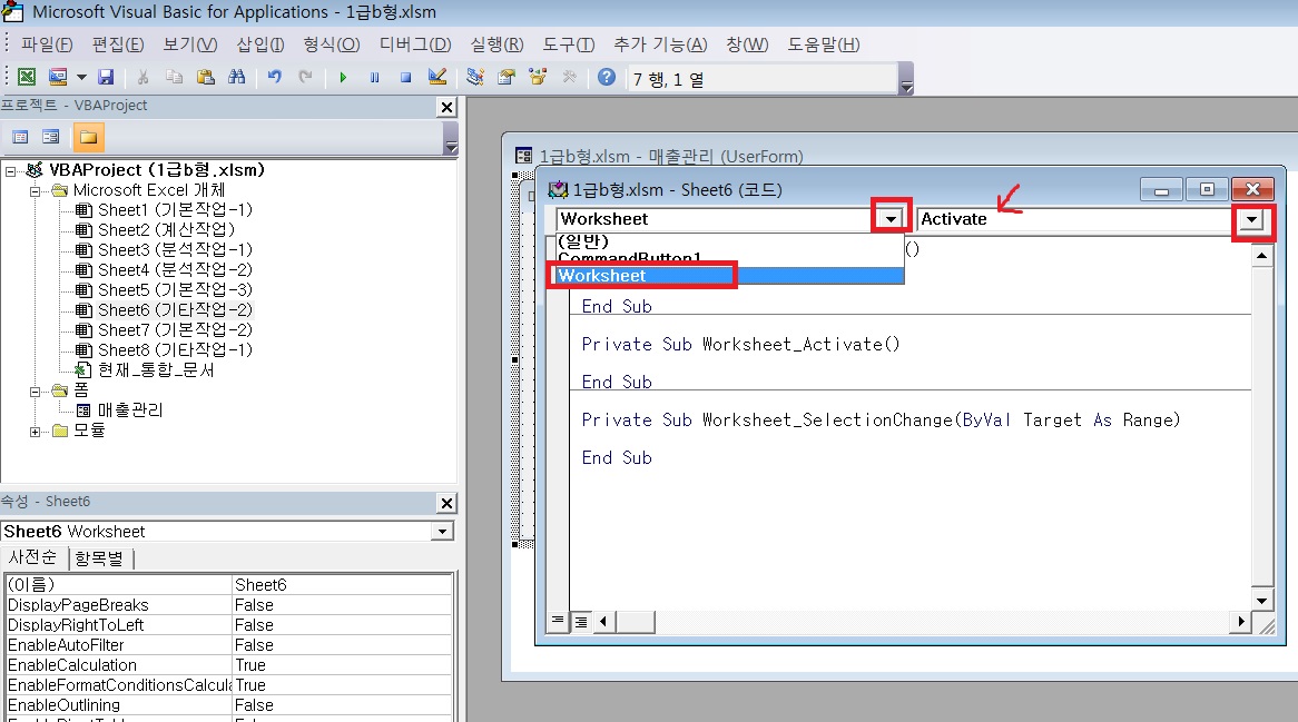 아래그림과 같이 프로젝트에서 sheet1(기타작업-3)을 더블클릭한 후 나타나는 프로시저창에서 worksheet 와 activate 를 선택하세요.