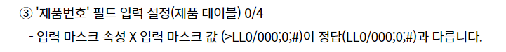 문제: '제품번호' 필드는 'AB1-123'형식으로 입력되도록 다음과 같이 설정하시오.