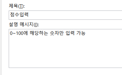 컴활1급실기에서 기본모의고사 1회 '분석작업-2'에서 설명메시지와,오류메시지를 정확하게 입력하였는데도 채점 프로그램에 0점이 나옵니다 ㅠ