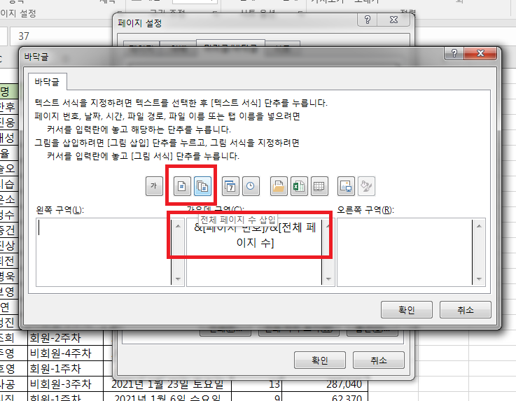바닥글 설정 X 페이지 하단 가운데 구역 값 (&P/&"/,보통"&N)이 정답(&P/&N)과 다릅니다.