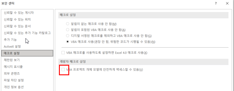 매크로 관련해서 초반에 보안경고 매크로를 사용할 수 없도록 설정해놨씁니다. 하고 뜨던데.. 이거랑 관련이 있나요?