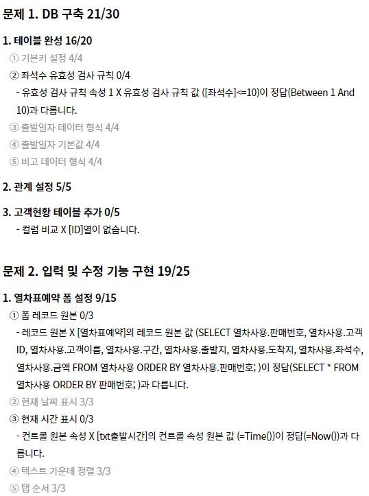 1. 네. 저희 채점 프로그램은 정답 파일과 비교하여 조금이라도 다르면 무조건 감점처리합니다. 하지만 실제 시험에서는 결과가 같으면 정답 처리합니다. 이점 감안하여 채점 결과를 적용하여 주세요.