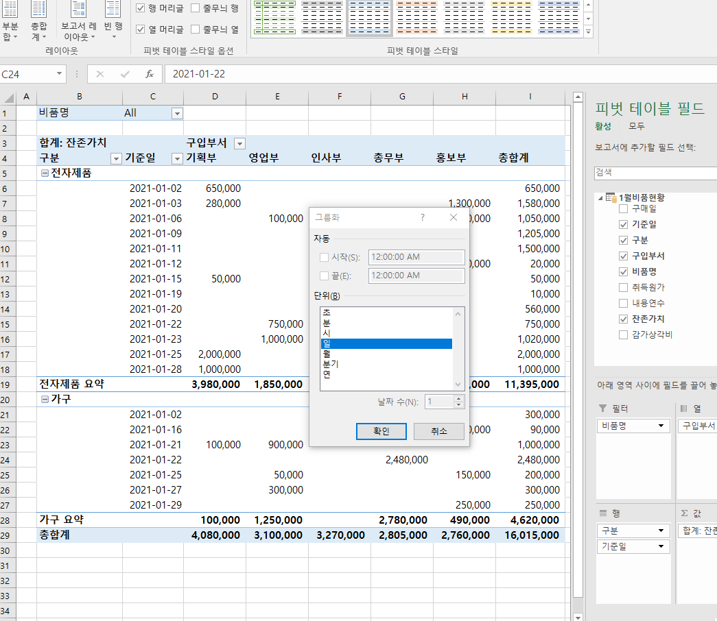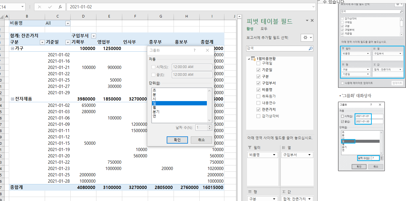 기준일을 그룹화할려고 하는데 정답처럼 시작 끝 날짜수가 비활성화 되어있어서 할수가 없어요 어떻게 해야할까요?