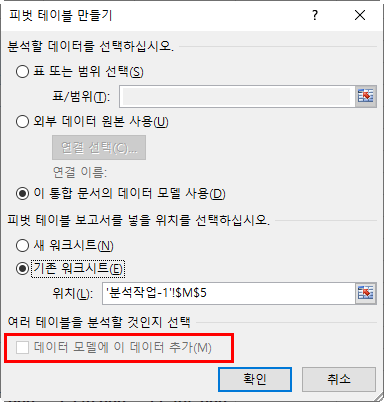 '피벗 테이블 만들기' 대화상자에서 '데이터 모델에 이 데이터 추가' 옵션은 문제의 지시사항에 지정하라는 지시사항이 있는 경우만 선택을 하셔야 합니다.