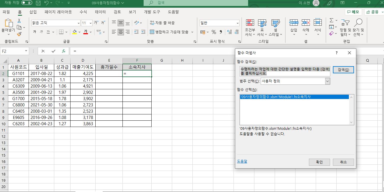 나 : '09사용자정의함수.xlsm'!Module1.fn소속지사()
