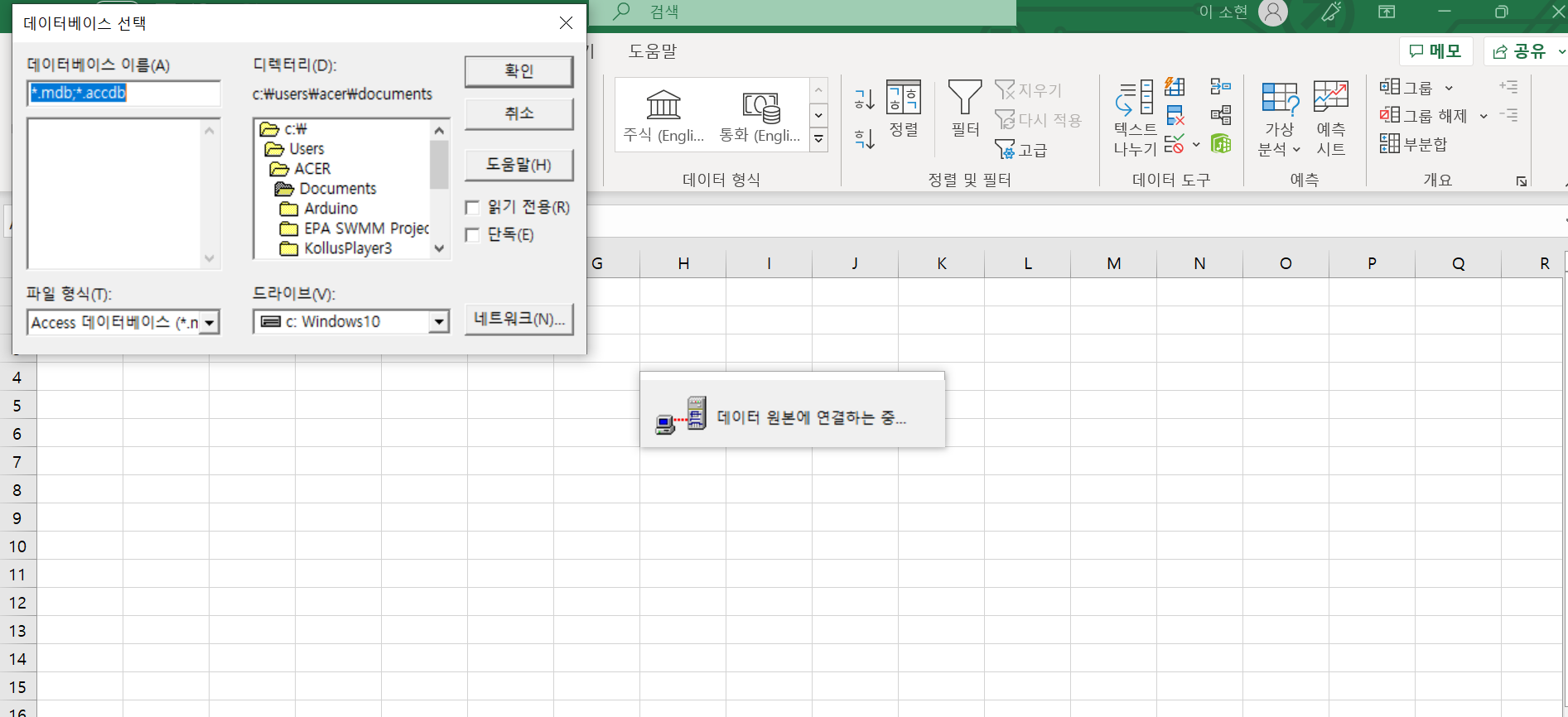 다른 CSV, TXT 파일은 외부데이터 연결이 되어 문제를 풀 수 있었지만 ACCDB 파일만 되지 않습니다.