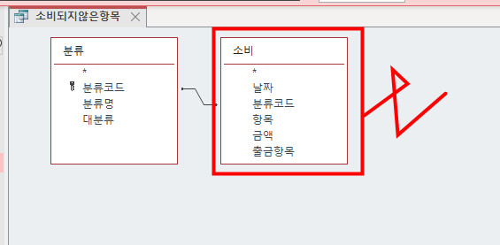 '소비되지 않은 항목' 쿼리에 추가되어 있는 '소비' 테이블을 삭제해 주세요.