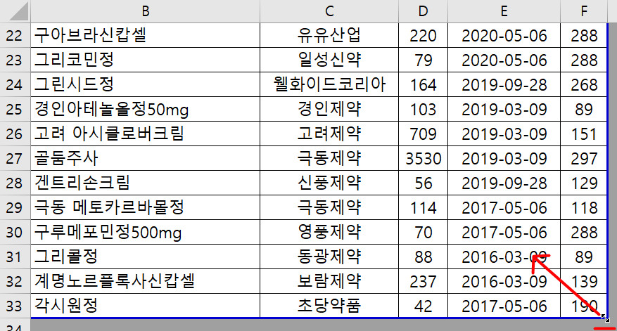 [페이지 나누기 보기]를 실행하면 데이터 테두리 부분에 파랑색 선이 표시되는데, 그 경계선에 마우스 포인터를 이동한 후 마우스 포인터가 ↔, ↕ 등으로 변경됐을 때 드래그하여 범위를 수정하면 됩니다.