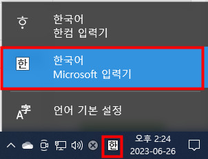 키보드가 '한컴 입력기'로 지정되어 있기때문입니다. 윈도우 작업표시줄의 오른쪽 끝 부분에 있는 [한] 아이콘을 클릭하여 [Microsoft 입력기]로 변경해 주세요.
