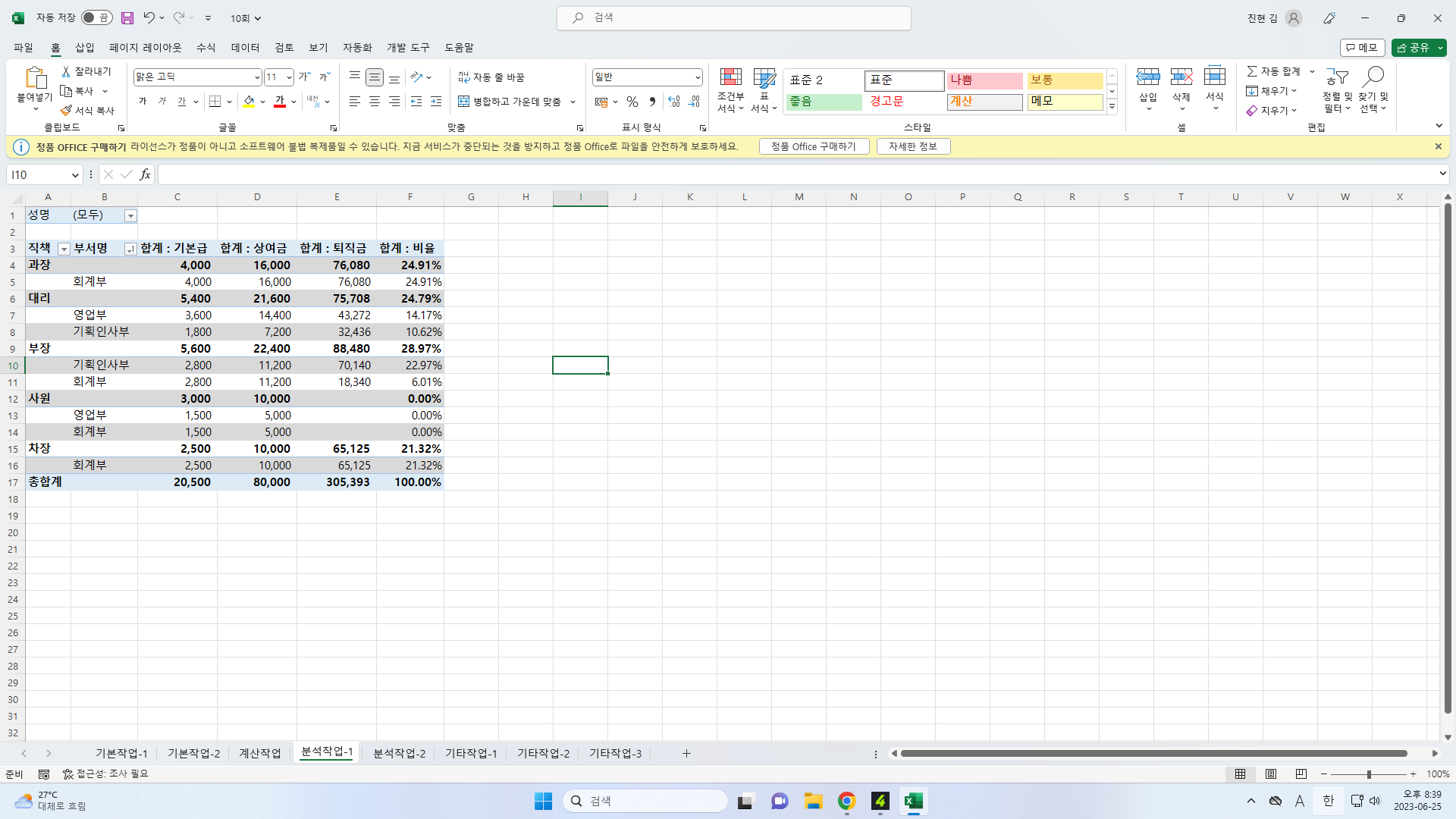 처음에 온라인 채점하기 했을때 틀렸길래 유튜브 강의까지 봤는데 선생님께서도 저랑 같은 답이 나오는데 문제에 주어진 자료에 따르면 [B7],[B8],[B9],[B10]이 각각 기획인사부,영업부 기획인사부, 회계부 순으로 나타나야 하는데 저도 그렇고 유튜브 강의도 그렇고 순서가 문제와 다르게 나오는데,