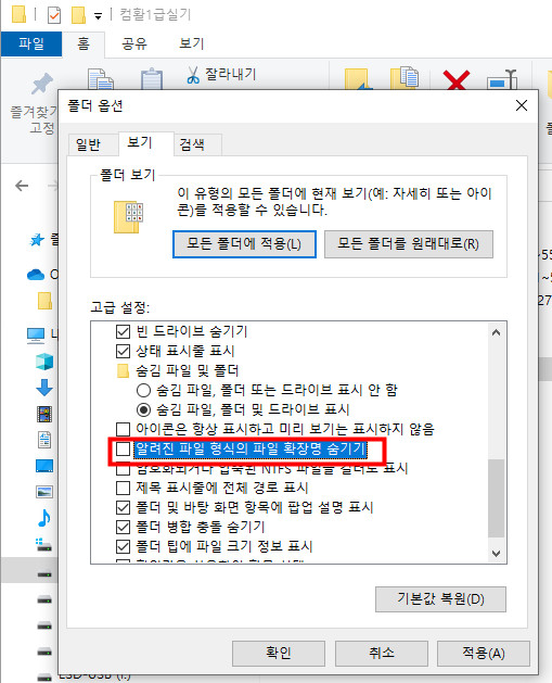 - 윈도우에서 확장자가 보이게 하려면 윈도우 탐색기를 실행한 후 [파일]-[옵션] 선택 -> '폴더 옵션' 대화상자의 '보기' 탭에서 고급 설정 중 '알려진 파일 형식의 파일 확장명 숨기기'의 체크 표시를 해제해 주면 됩니다.