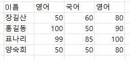 이름을 기준으로 오름차순 정렬하면 이름 열을 기준으로 각 행의 데이터 순서가 변경됨