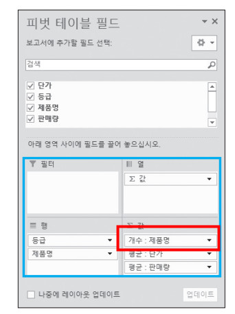 '피벗 테이블 필드' 대화상자의 값 영역에 '제품명'을 추가해 주세요. 제품명으로 개수를 구한 다음 값 필드 설정 대화상자에서 제품명을 제품수로 변경해 주면 됩니다.