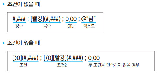 조건이 없을 때와 조건이 있을 때의 사용자 지정 표시형식의 지정 방식이 다릅니다. 아래 그림을 참고하세요.