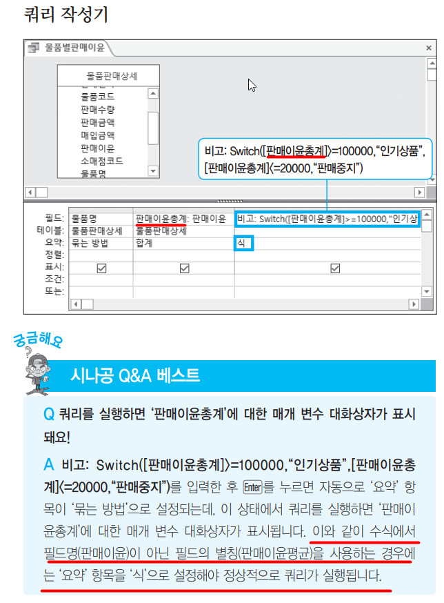 - 수식에서 필드명이 아닌 필드의 별칭을 사용하는 경우에는 ‘요약’ 항목을 ‘식’으로 설정해야 정상적으로 쿼리가 실행되는데, 이 문제에서는 별칭을 사용하지 않았으니 식으로 지정하지 않아도 됩니다. 아래 그림을 읽어보시면 필드명과 별칭의 차이를 아실꺼예요.