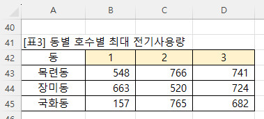 예를들면 아래 그림에서 [B43] 셀에 수식을 입력한 후 채우기 핸들을 드래그하여 나머지 셀에도 값을 구하려고 할 때, 목련동, 장미동, 국화동은 한 열에 입력되어 있으므로 조건을 지정한 후 채우기 핸들을 드래그했을 때 열을 고정해야 하므로 $A43과 같이 열 문자 앞에 $를 붙이고 1, 2, 3은 한 행에 입력되어 있으므로 채우기 핸들을 드래그했을 때 행 번호는 항상 고정되어 있어야 하므로 B$42와 같이 행 번호를 고정해 주는 것입니다.