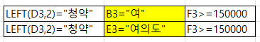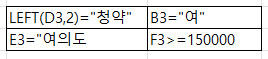 =AND(LEFT(D3,2)="청약",OR(B3="여",E3="여의도"),F3>=150000) 이렇게는 안되나요?ㅠ