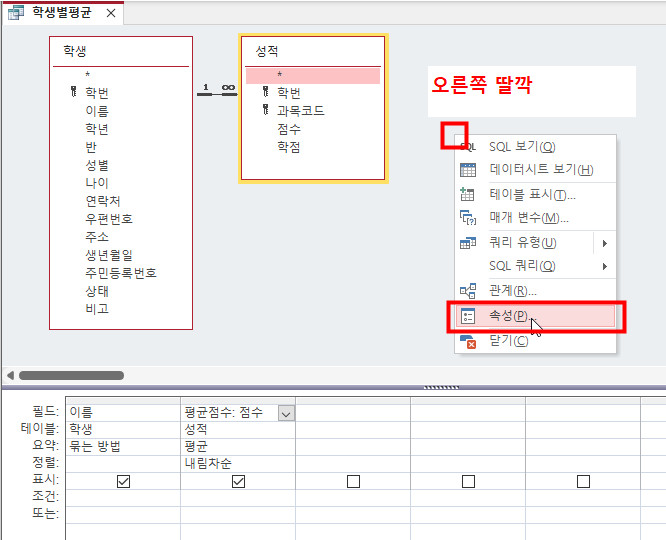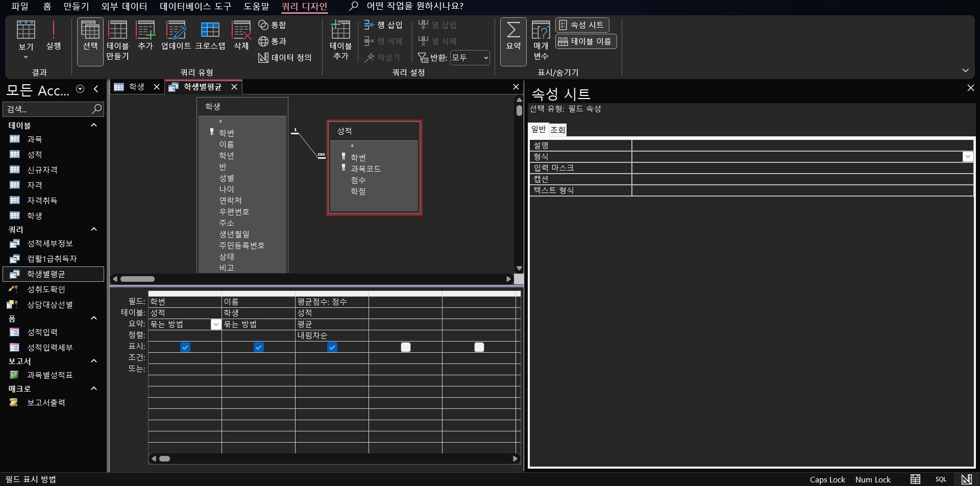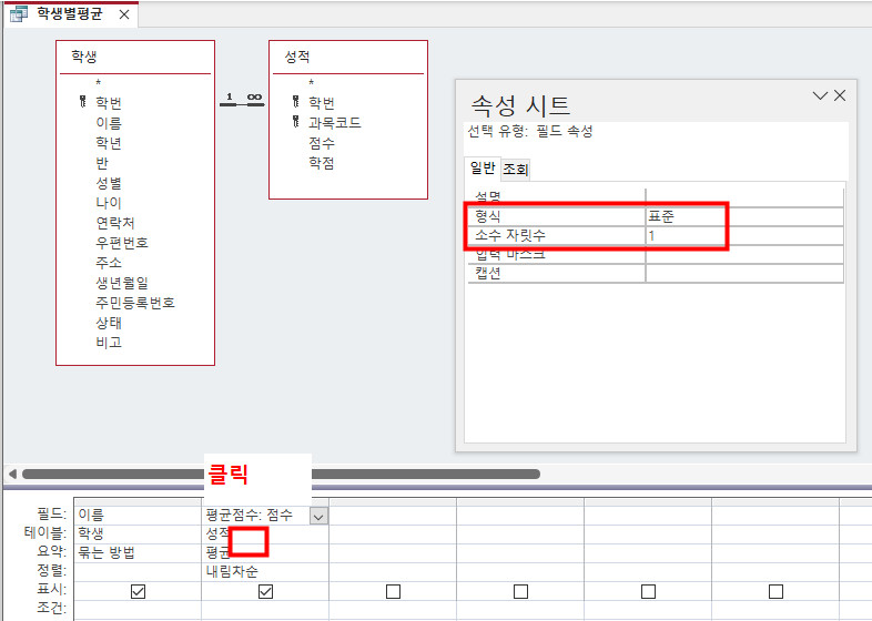 이어서 '평균점수' 부분을 클릭하면 속성 시트 창이 필드 속성 창으로 변경됩니다. 나머지를 지정하면 됩니다.