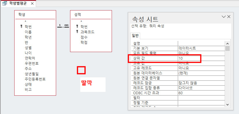 쿼리 작성기에서 테이블이 표시된 부분의 빈 영역을 마우스 오른쪽 단추로 클릭한 후 [속성]을 선택한 후 '속성 시트'가 표시되면 테이블이 표시된 빈 영역을 클릭하면 쿼리 속성 시트가 표시됩니다.