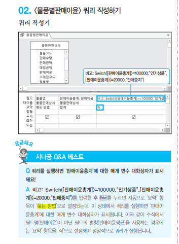 4-2 : 수식에서 필드명(판매이윤)이 아닌 필드의 별칭(판매이윤평균)을 사용하는 경우에 ‘요약’ 항목을 ‘식’으로 설정해야 정상적으로 쿼리가 실행됩니다. 아래는 교재에 있는 설명이니 쿼리 작성기와 연결하여 해설을 읽어보시기 바랍니ㅏ.