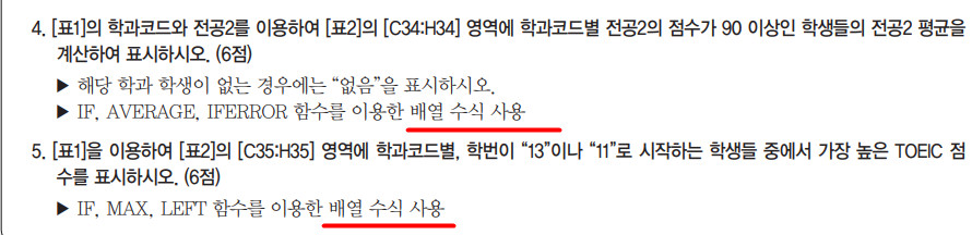 문제에 배열 수식을 사용하라는 지시사항이 있으므로 반드시 배열 수식을 작성해야 합니다.