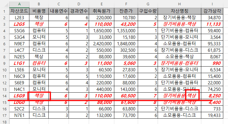 '비품명'이 '책상'인 데이터가 아니라 '자산명칭'의 뒤에 2글자가 "책상"인 것을 추출하는 문제입니다. '자산명칭'의 뒤에 두 글자가 '책상'인데 비품명이 "책장"인 데이터가 추출된 것입니다.