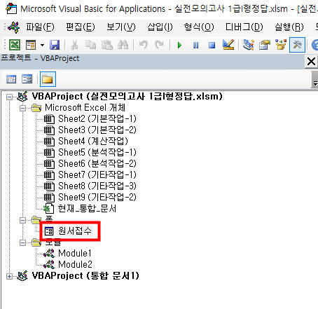 VBA 창에서 [보기]-[프로젝트 탐색기]를 선택하여 '프로젝트' 창을 화면에 표시한 후 화면에 표시하고자 하는 개체를 더블클릭 해주면 됩니다. 예를들어 아래 그림에서 원서접수 폼을 화면에 표시하려면 '원서접수' 부분을 더블클릭하면 됩니다.