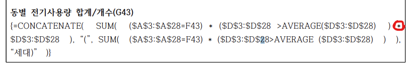 SUM 함수만을 이용하여 합계를 구하려면 조건과 합계를 구해야 할 범위를 *로 연결해야 합니다.