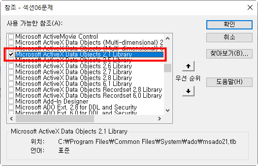 네이버에 검색해보니 도구에 가서 참조에 activex data objects라는걸 체크하라고 해서 했는데도 똑같이 노란줄이 표시되며 ,