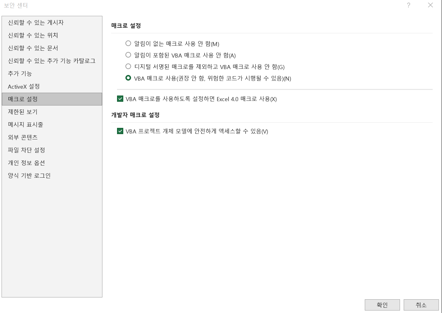인터넷에 찾아봐서 엑셀 보안 설정을 바꿔바도 문제가 해결되지 않았습니다. 수정한 설정 사항 및 제가 사용하던 문제 파일도 같이 첨부했습니다.