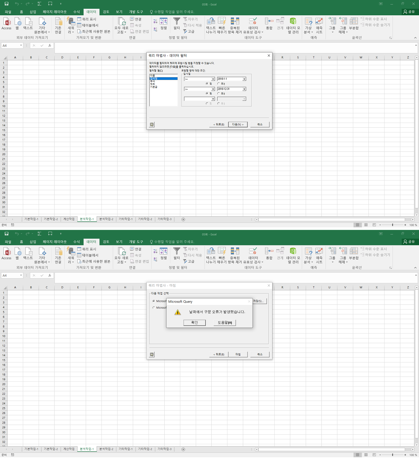 올려주신 그림과 동일하게 날짜를 지정하여 외부 데이터를 불러오면 저는 정상적으로 실행이 됩니다. 즉 조건이나 파일 상의 문제가 아니라 프로그램상의 오류인 듯 합니다. 불러올 파일의 위치가 복잡한 경우 간혹 불어오기를 할때 오류가 발생하기도 하는데 혹시 모르니 c 드라이브 바탕에 <사원관리.accdb>를 넣은 다음 다시 한번 해보시기 바랍니다. 정확한 도움을 못드려 죄송합니다.
