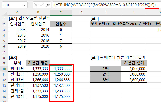 정답이 =TRUNC(AVERAGE(IF($A$20:$A$39=A10,$G$20:$G$39))) 인데,