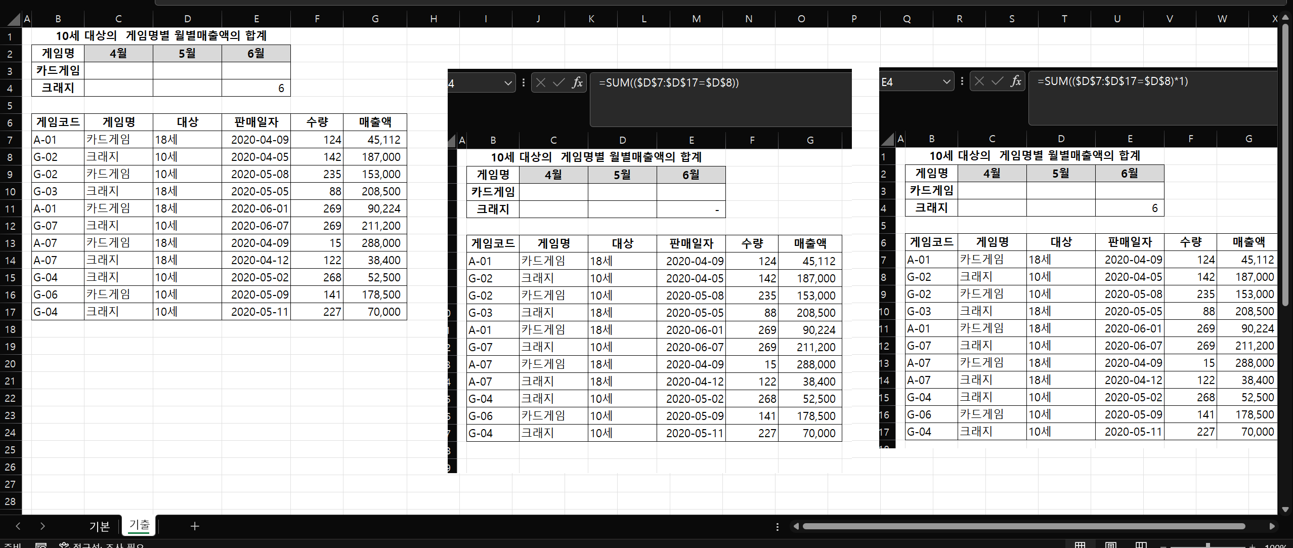 E4셀에서 10세 대상 게임 수를 구하려고