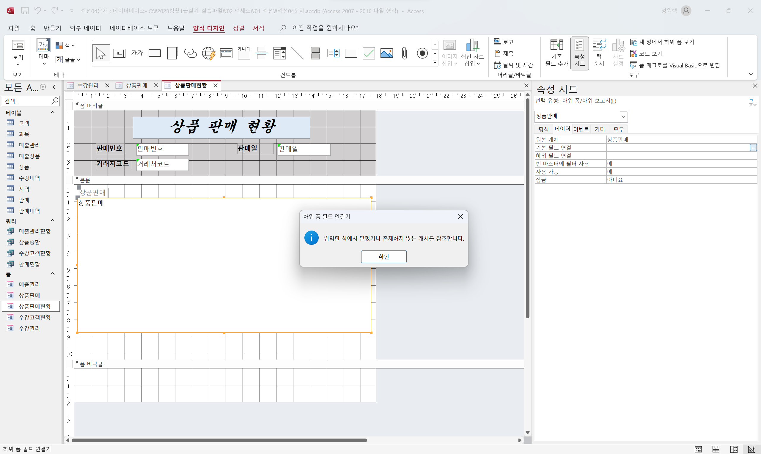 - 하위 폼으로 연결해야 하는 '상품판매' 폼을 닫은 다음 다시 해 보시기 바랍니다. 하위 폼이 실행된 상태에서는 하위 폼 연결이 안됩니다.