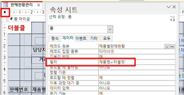 해당 폼을 디자인 보기로 열어 폼 선택기를 더블클릭하면 속성 시트 창의 [데이터] 탭의 필터 속성에 조건이 지정되어 있는 것을 확인할 수 있습니다. 필터(filteron) 속성이 지정되어 있으니 필터 속성을 false로 지정하므로 전체 데이터를 표시하게 하는 것입니다.