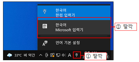 입력기가 ‘한컴 입력기’로 설정되었기 때문입니다. 다음과 같이 Windows 작업 표시줄 알림 영역의 ‘입력기’ 아이콘을 클릭하고 [한국어 Microsoft 입력기]를 선택한 후 [Ctrl]+[Shift]+[Enter]를 누르면 수식에 중괄호({ })가 입력됩니다.