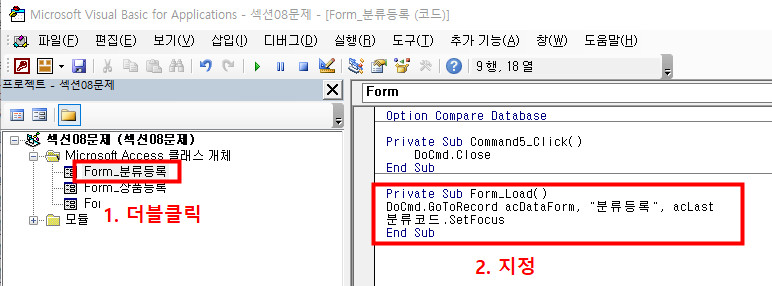 엑세스 섹션8 224 문제1-4 마지막 레크드에 컨트롤 포커스 이동 문제