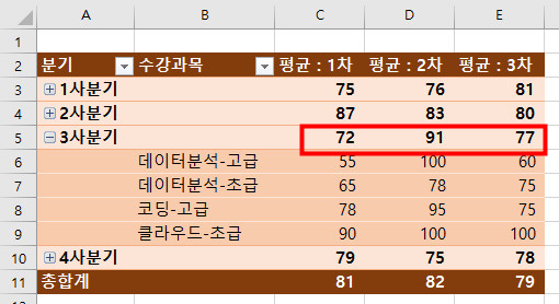 피벗테이블에서 세 번째 조건에 3분기의 하위 데이터만을 표시하라고 하는데, 저는 3사분기의 하위 데이터만 표시가 되지 않고 1, 2, 4분기처럼 평균 데이터도 표시가 됩니다.