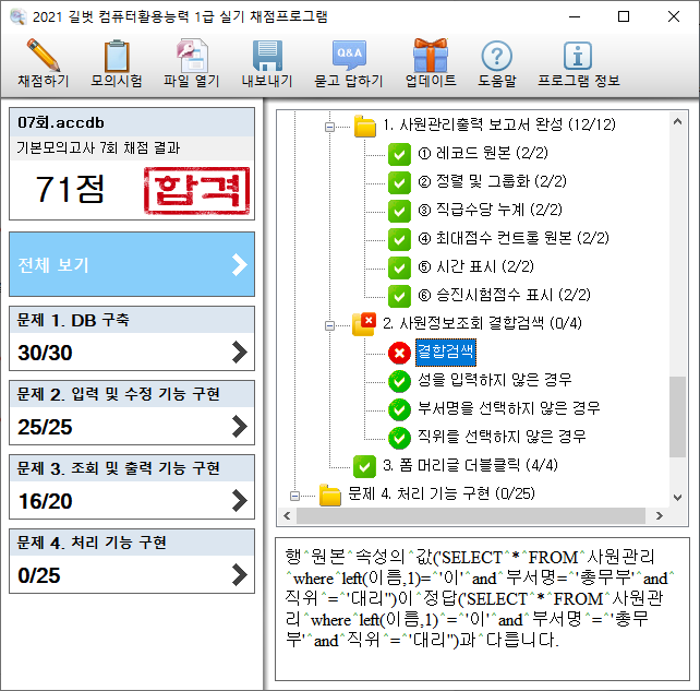 특정 값을 넣었을 경우를 보여주는 것으로 조건을 지정하지 않아도 됩니다. 저희 채점 프로그램은 정답과 비교하여 다른 부분을 틀린 것으로 감점하는데, 코드에서 띄어쓰기 부분이 정답과 달라 감점된 것입니다. 실제 시험장에서는 문제의 지시사항을 모두 만족하고 결과가 정상적으로 실행되면 맞는 것으로 채점됩니다.