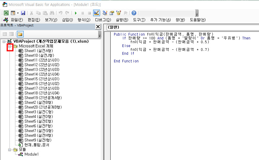- VBA 창을 실행한 후 아래 그림에서 빨강색으로 표시된 부분을 클릭하여 [-]로 표시되도록 하면 워크시트가 표시됩니다.
