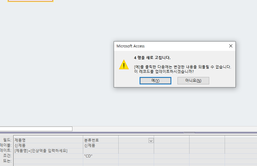 3번 문제를 답과 똑같이 입력헀는데 예를 누르면 아무것도 안뜹니다.. 다시 실행 누르면 저창이 똑같이 뜨고 테이블 만들기로 하면 업데이트가 풀리고 어떻게 해야될지 모르겠습니다ㅠㅠ