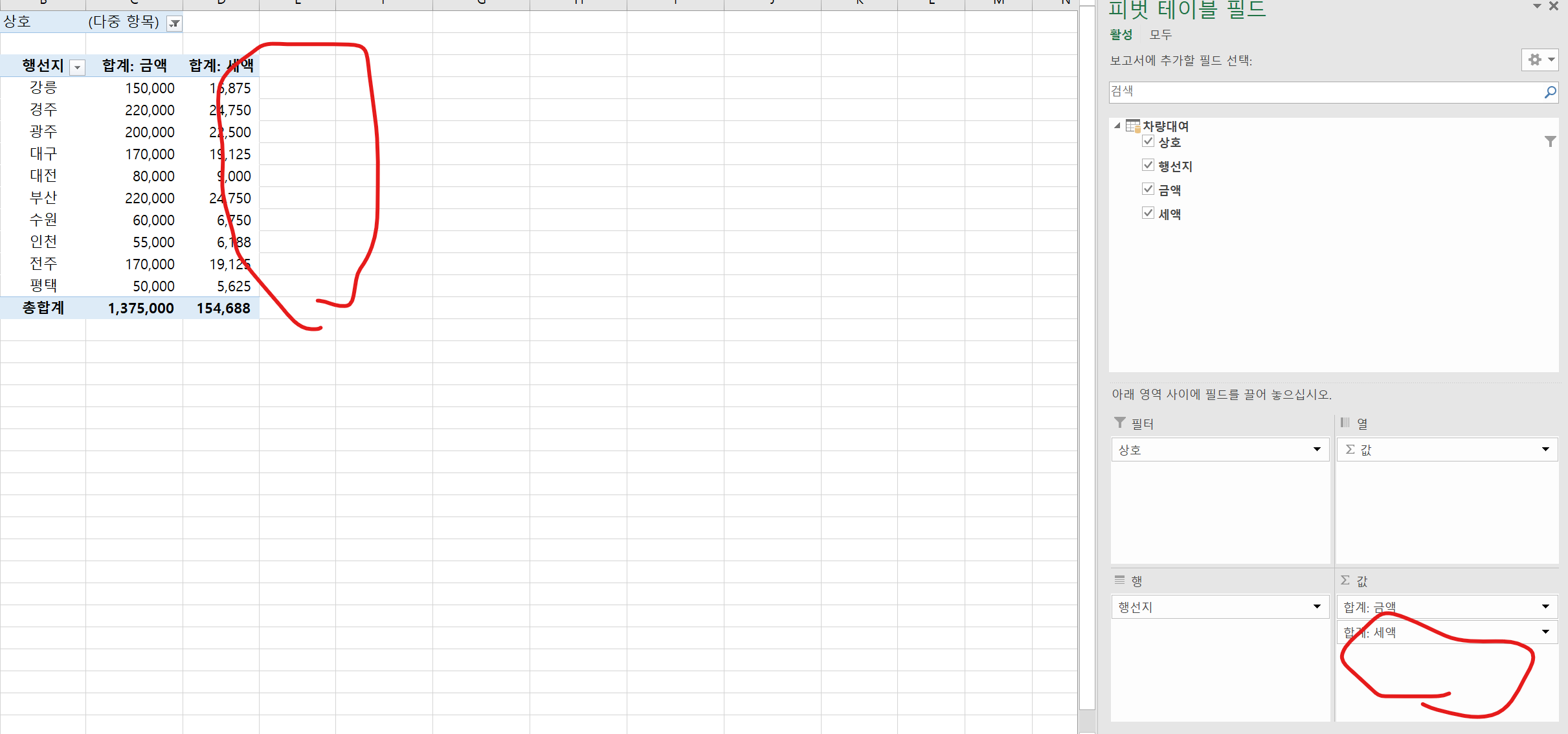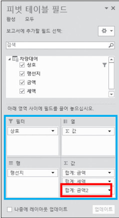 피벗테이블보고서에서 금액의 합계가 하나밖에 안나오는데 금액비율은 어떻게 만드는건가요?