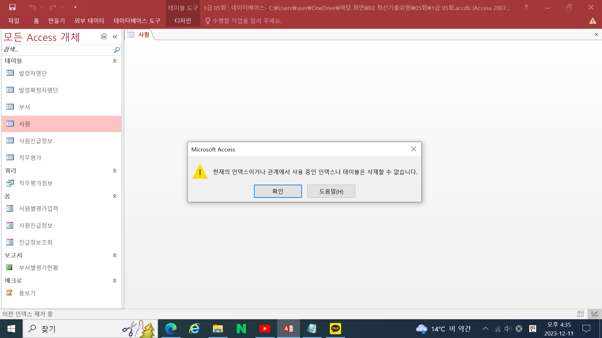 333쪽 문제 1 DB구축 - 4. '사번'필드의 인덱스'