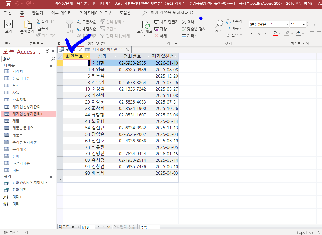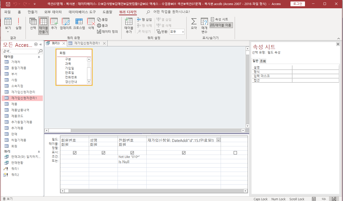 참고로 다음에 질문을 하실 때는 그림이 아닌 실습한 액세스 파일을 올려주세요. 파일을 직접 열어 확인해야 보다 정확한 답변을 해드릴 수 있습니다.
