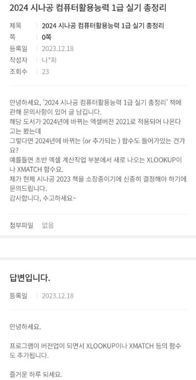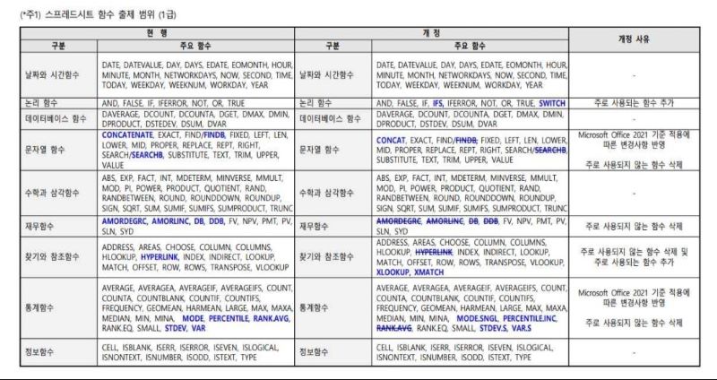 이게 현행 함수와 개정되는 함수이고, 이것을 보고 현재 제가 [2023 시나공 컴퓨터활용능력 1급 실기 기본서]를 소장하고 있기에 문의를 드렸었습니다.