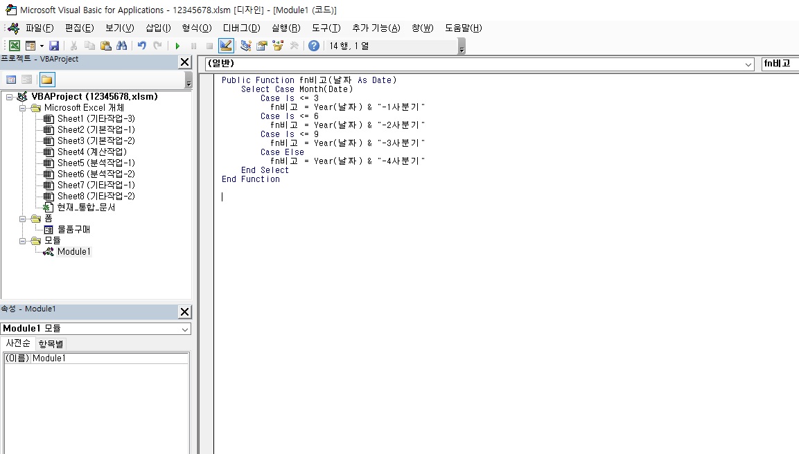 위 1번 사진이 제가 VBE 모듈에서 작성한 코드고 2번 사진이 셀에 적용시켰을 때 오류 발생 상황입니다.