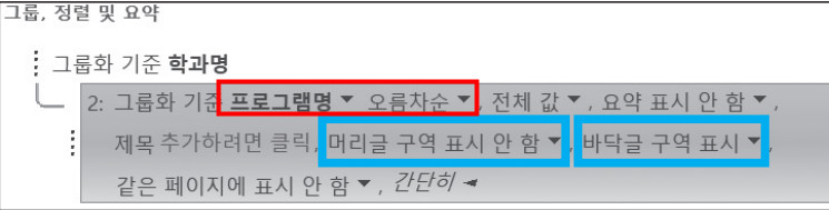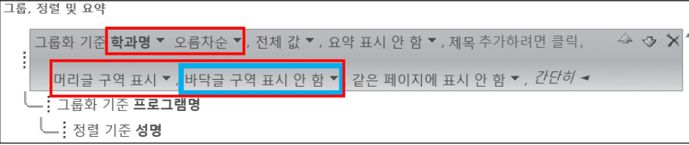 학과명과 프로그램명의 경우는 정렬 기준과 머리글/바닥글 등을 한 번에 설정할 수 있기 때문입니다